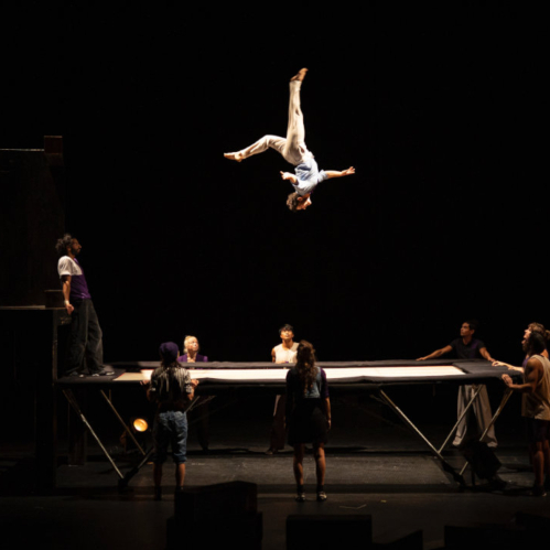 Plan anzeigenÊtre en apesanteur pendant dix minutes ? C’est le défi que lance le voltigeur et metteur en scène colombien Edward Aleman aux douze interprètes de Salto. Dans une scénographie en forme de terrain de jeu collectif, les acrobates entrent en compétition. Trampoline, bascule, barres russes… Tous les agrès sont bons pour défier les lois de la gravité !