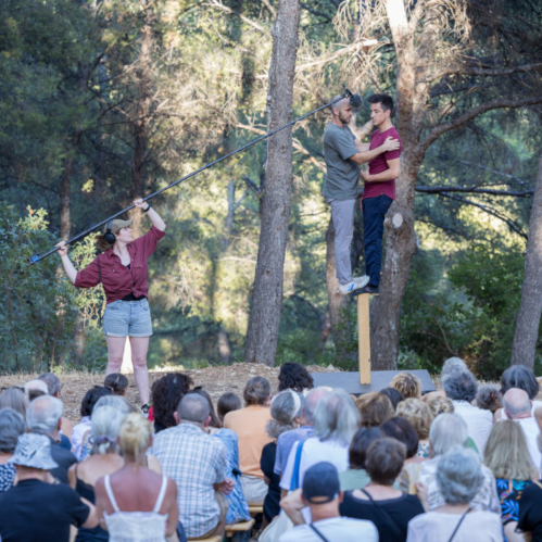 Plan anzeigenPerchés sur une poutre trop petite pour pouvoir tous les deux y poser les pieds, deux hommes discutent tout bas. Tandis que le tour de force s’installe, plus inouï à mesure que les minutes passent, un ingénieur du son à l’esprit malicieux débarque pour nous faire entendre ce que les acrobates se disent. On s’esclaffe du décalage entre les sujets de conversation et les corps en tension, et on se laisse charmer par cette proposition délicieusement absurde.